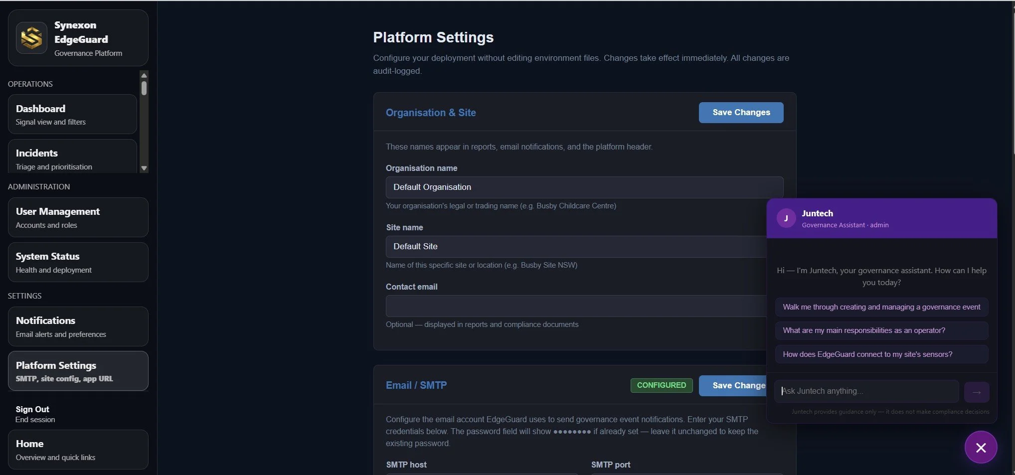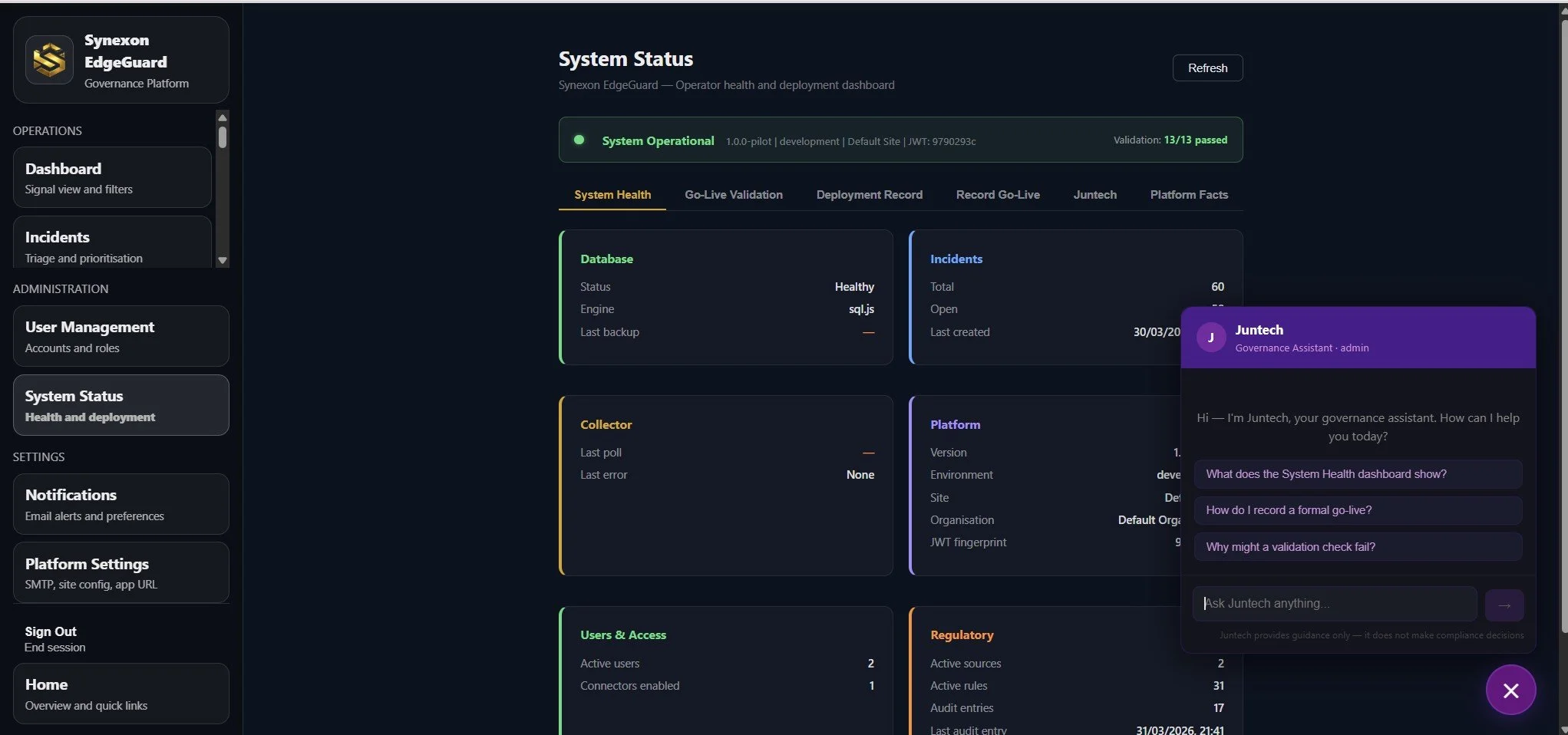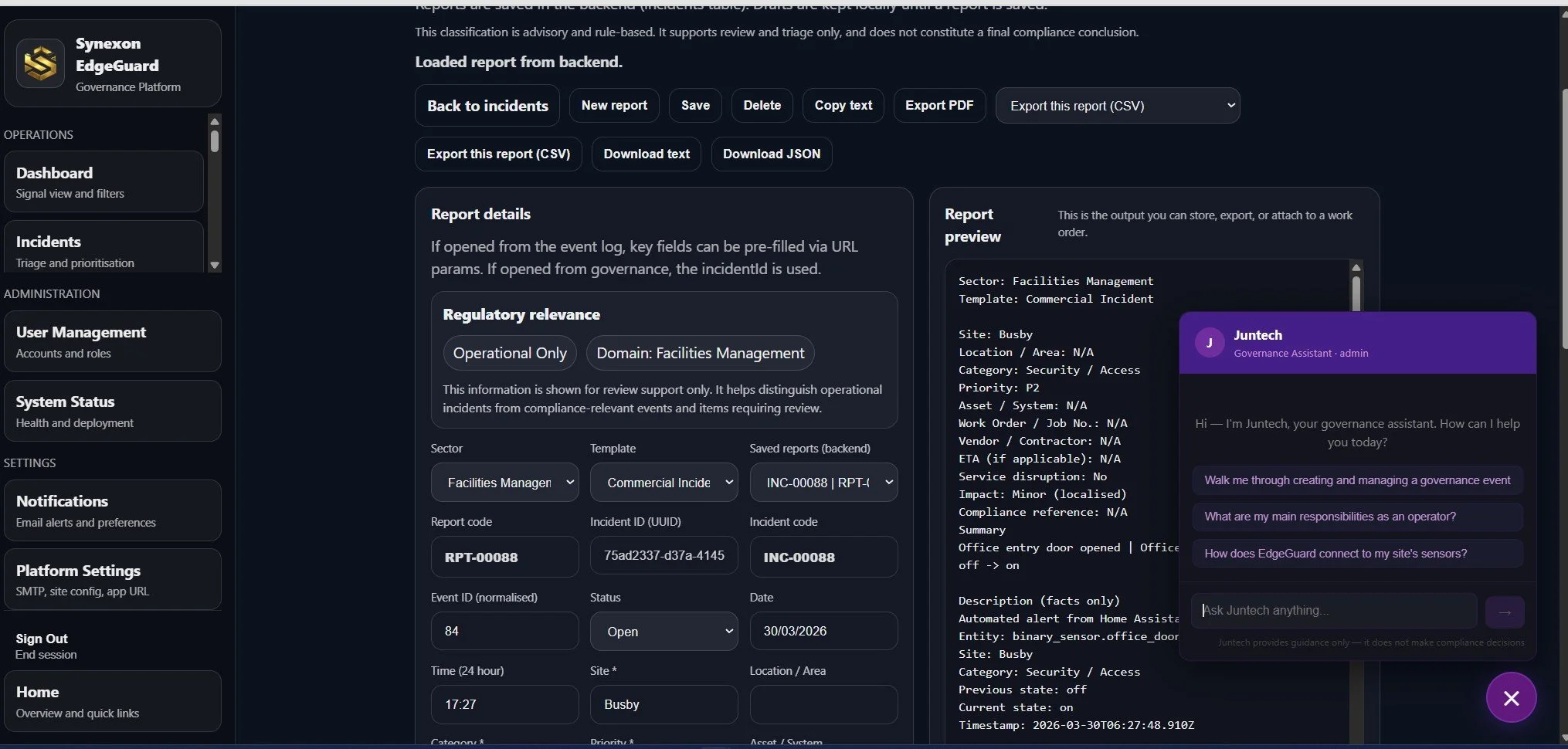 JUNTECH AI operator guidance assistant — plain-language compliance guidance for operators, embedded directly within the platform